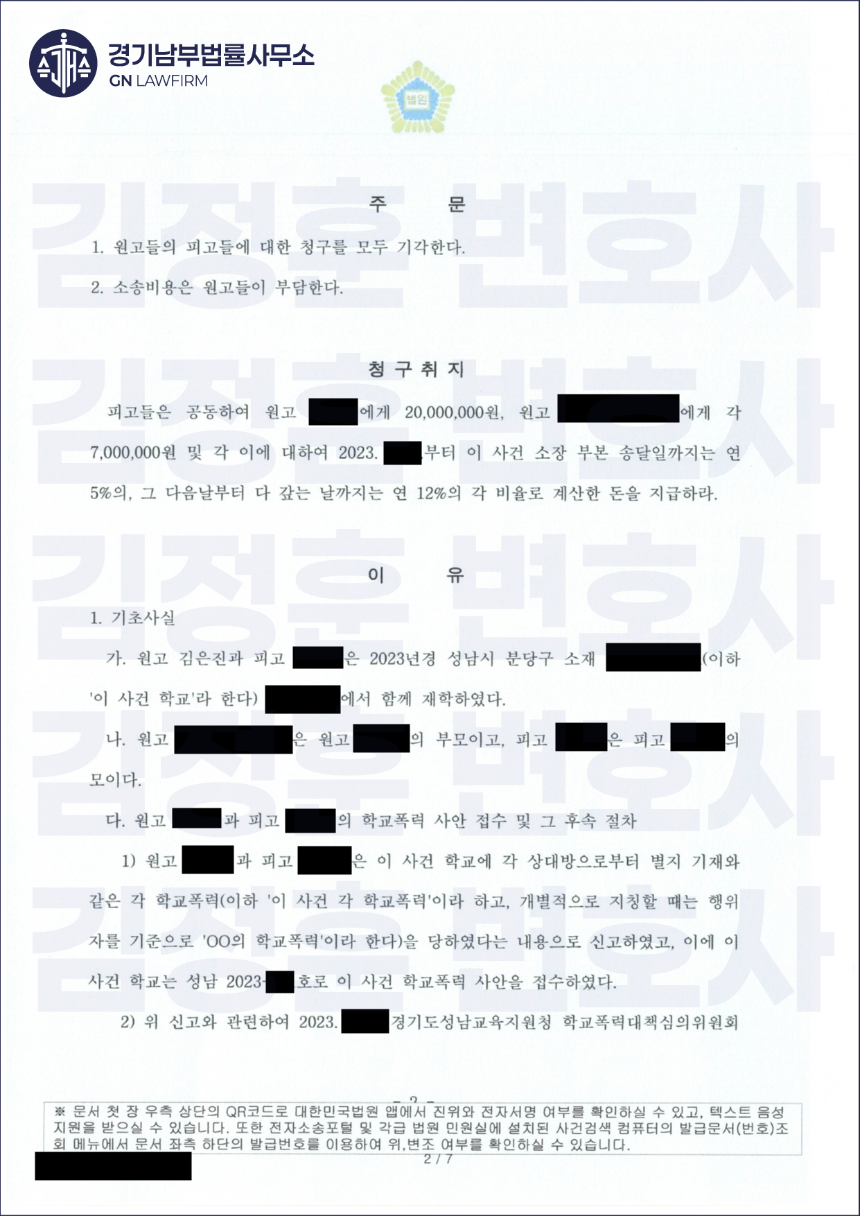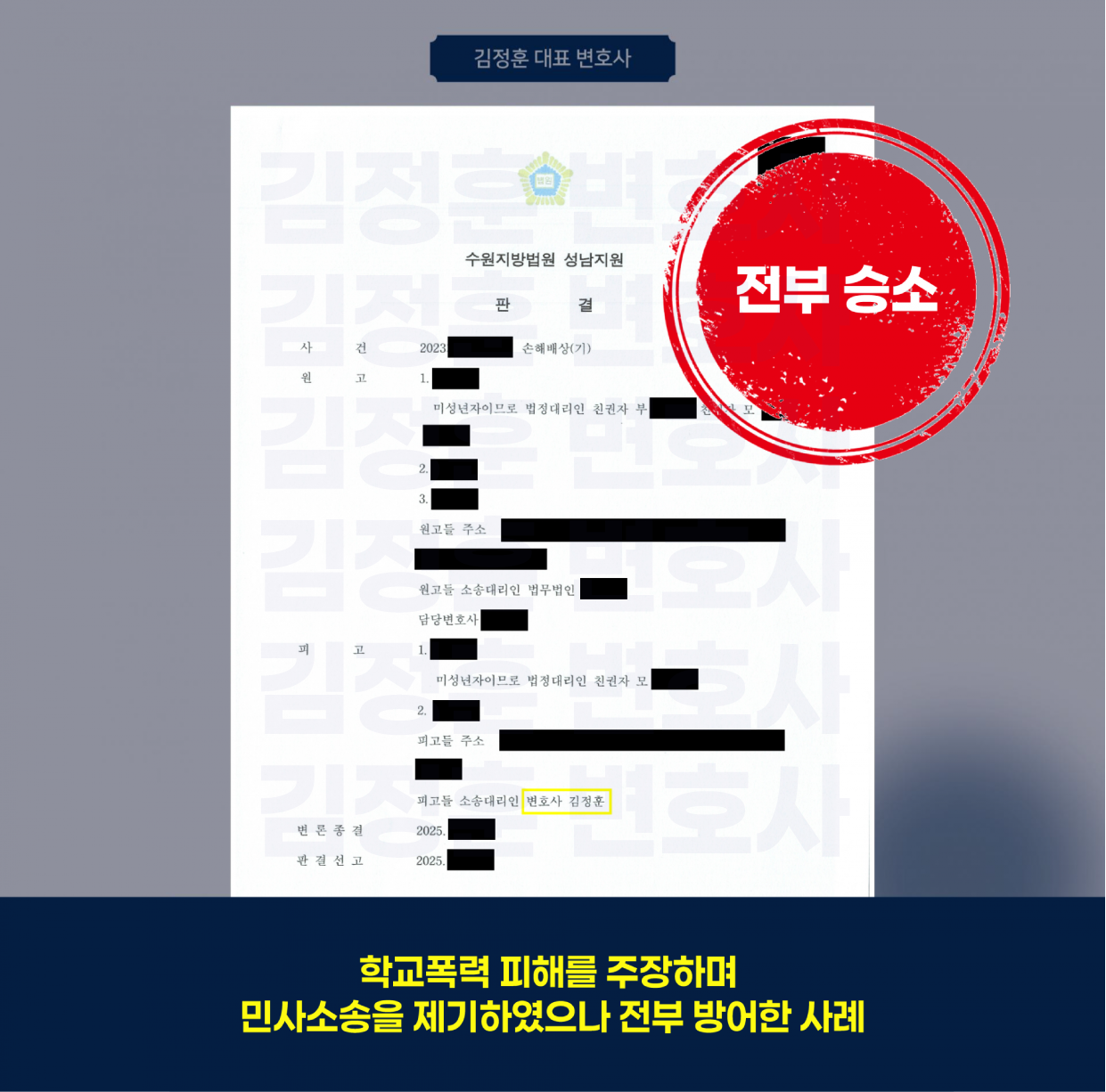 김정훈 변호사는 학생들 쌍방 간 장난이나 다툼 과정에서 발생한 신체적 접촉 및 언행이었고, 사회통념상 용인될 수 있는 범위를 벗어나지 않았음을 다양한 증거(학교 진술, 영상자료 등)로 입증하였습니다.