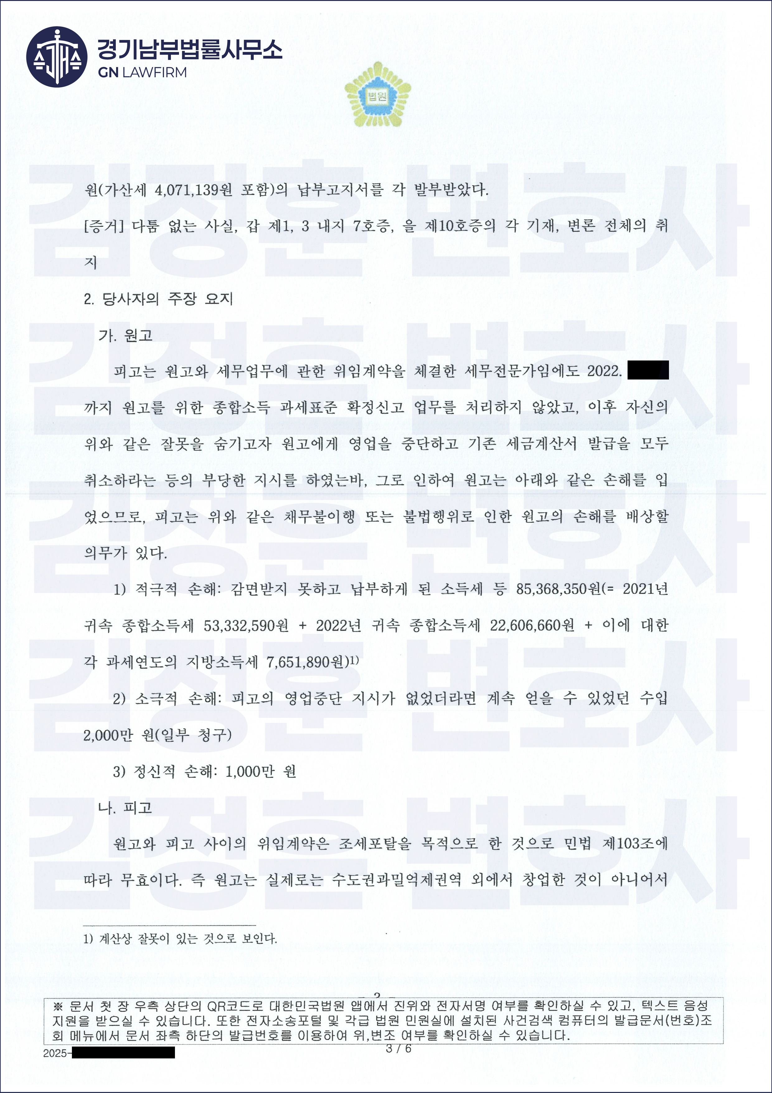 본 사건은 원고가 피고(세무사)를 상대로, 종합소득세 신고 지연 및 세무업무 처리상의 과실을 이유로 약 1억 1천만 원 상당의 손해배상 청구를 제기한 사안입니다.
