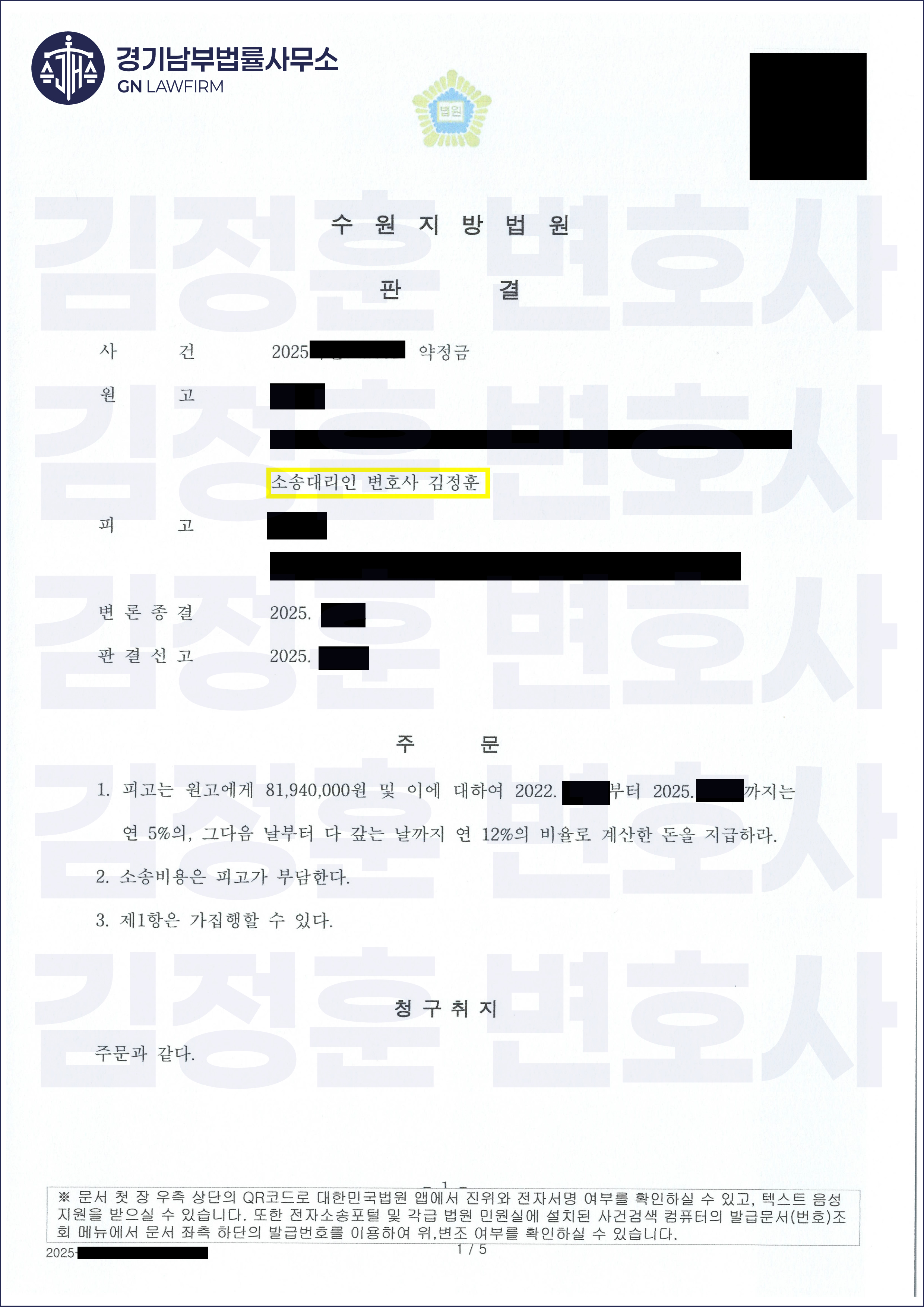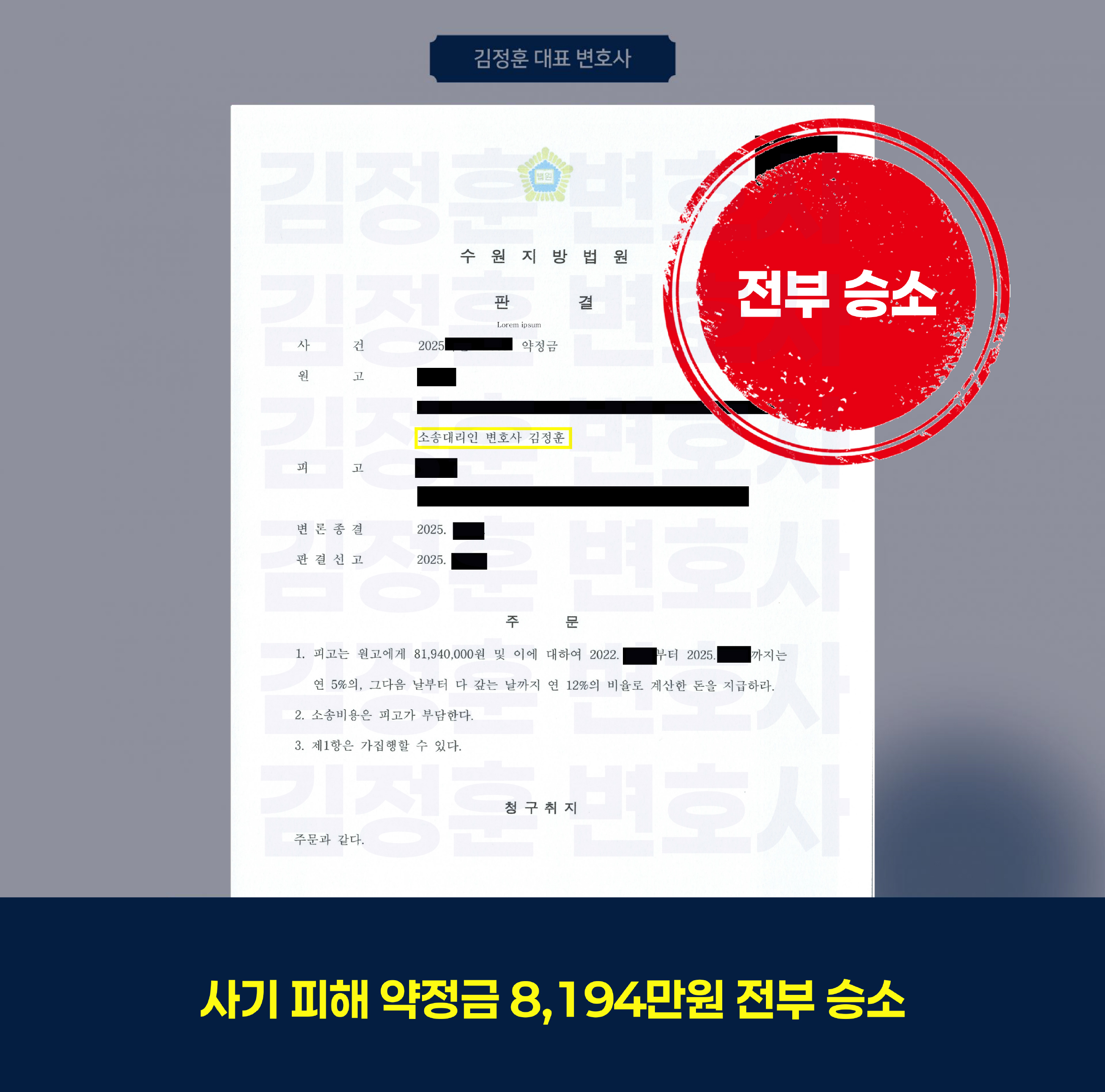 본 사건을 심리한 수원지방법원은 김정훈 변호사의 주장과 증거를 모두 받아들여 2025년 8월 원고 전부 승소 판결을 선고하였습니다.