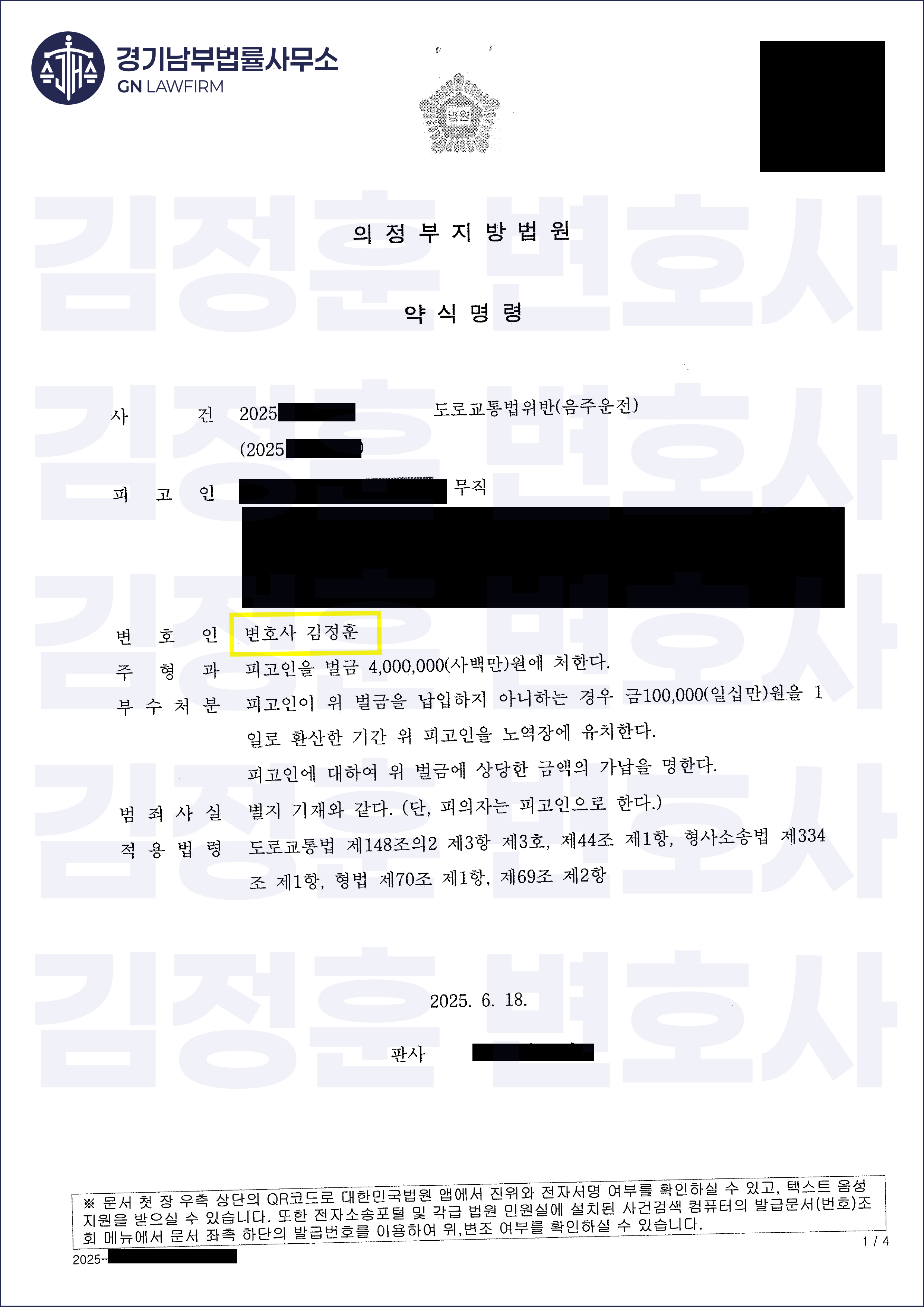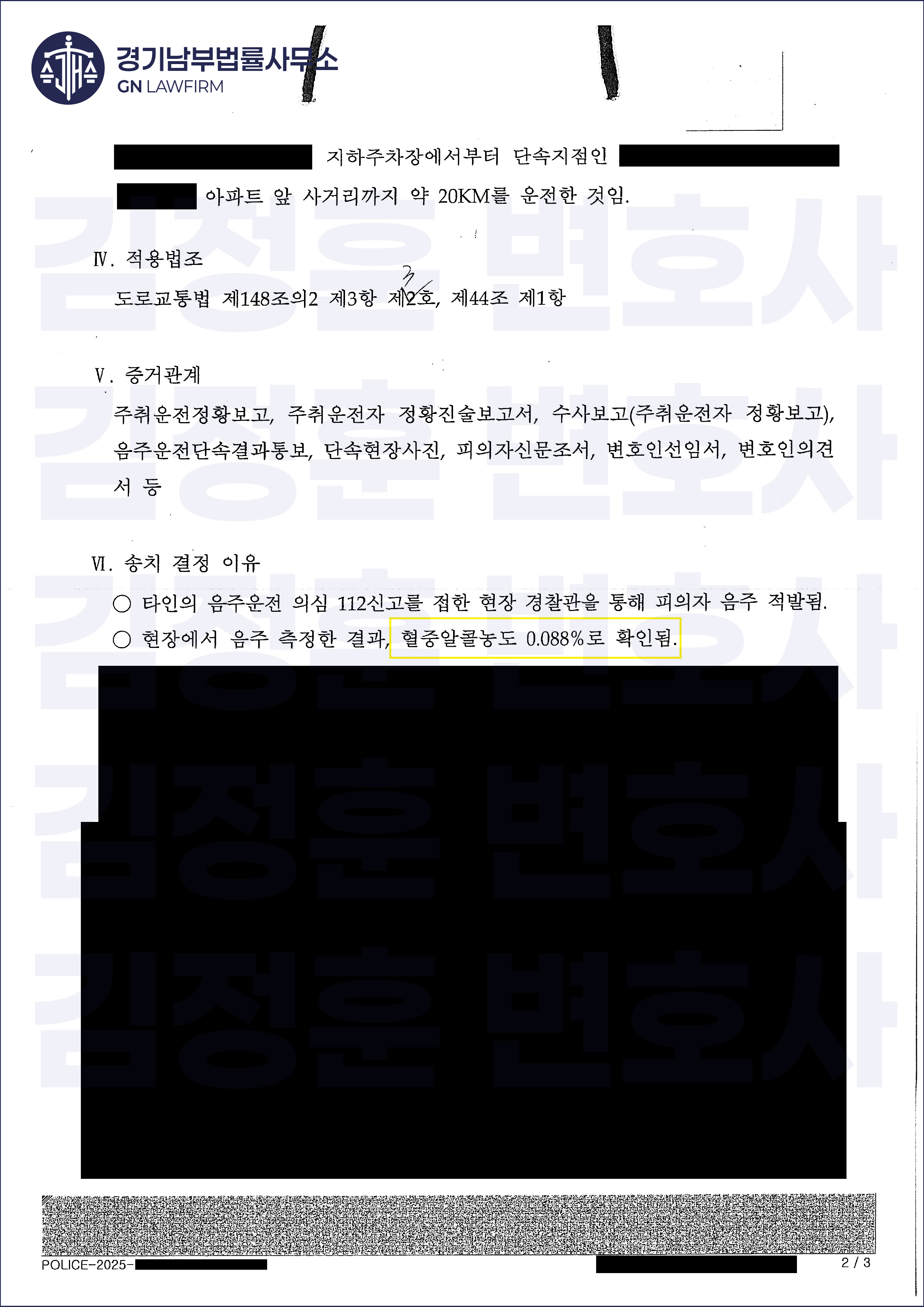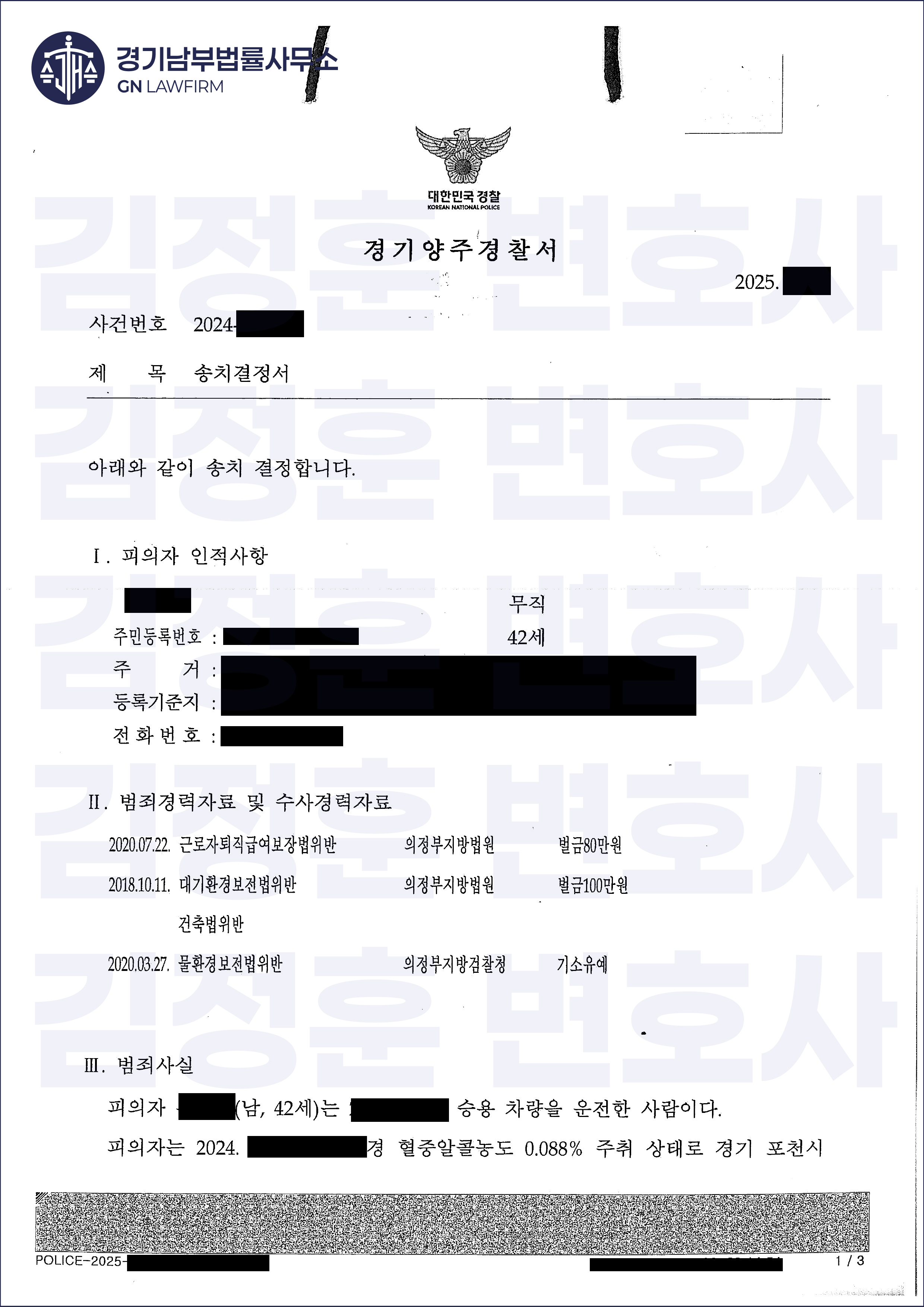 김정훈 변호사는 위드마크 공식으로 재산정된 0.079%를 주장하는 변호인 의견서를 검찰에 제출하며 의뢰인이 깊이 반성하고 있으며 생계를 고려하여 최대한의 선처를 베풀어 달라고 호소했습니다. 그 결과, 검찰은 변호인의 주장을 받아들여 운전면허 취소(0.088%) 수치를 운전면허 정지(0.079%)로 변경시키고, 더불어 초기에 예상했던 벌금(5~600만 원)보다 낮은 벌금 400만원이 선고되었습니다.
