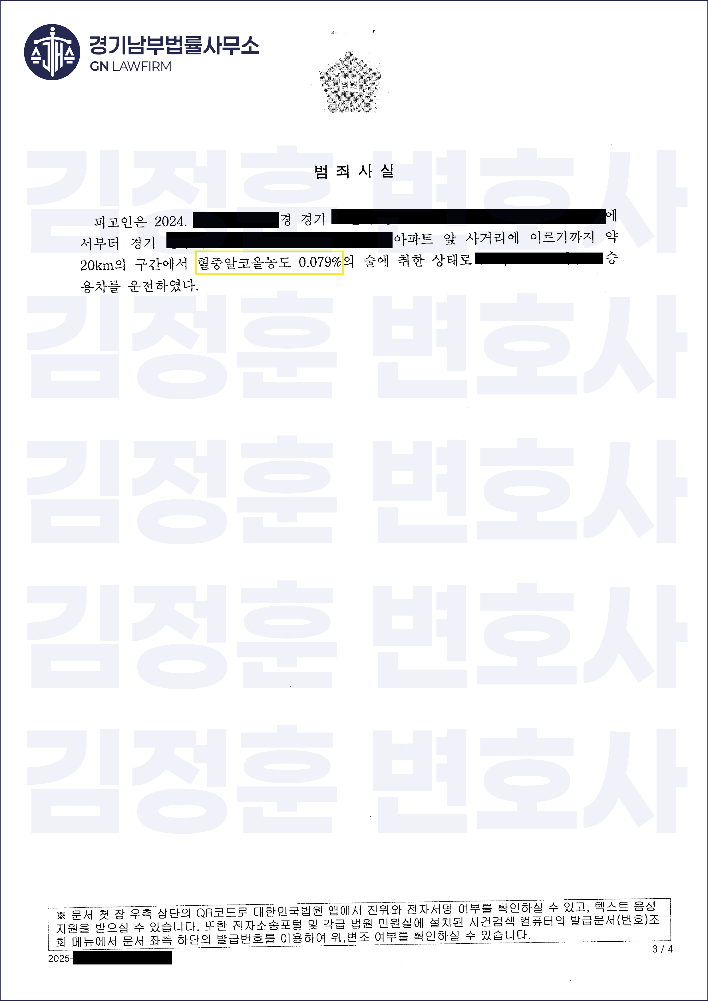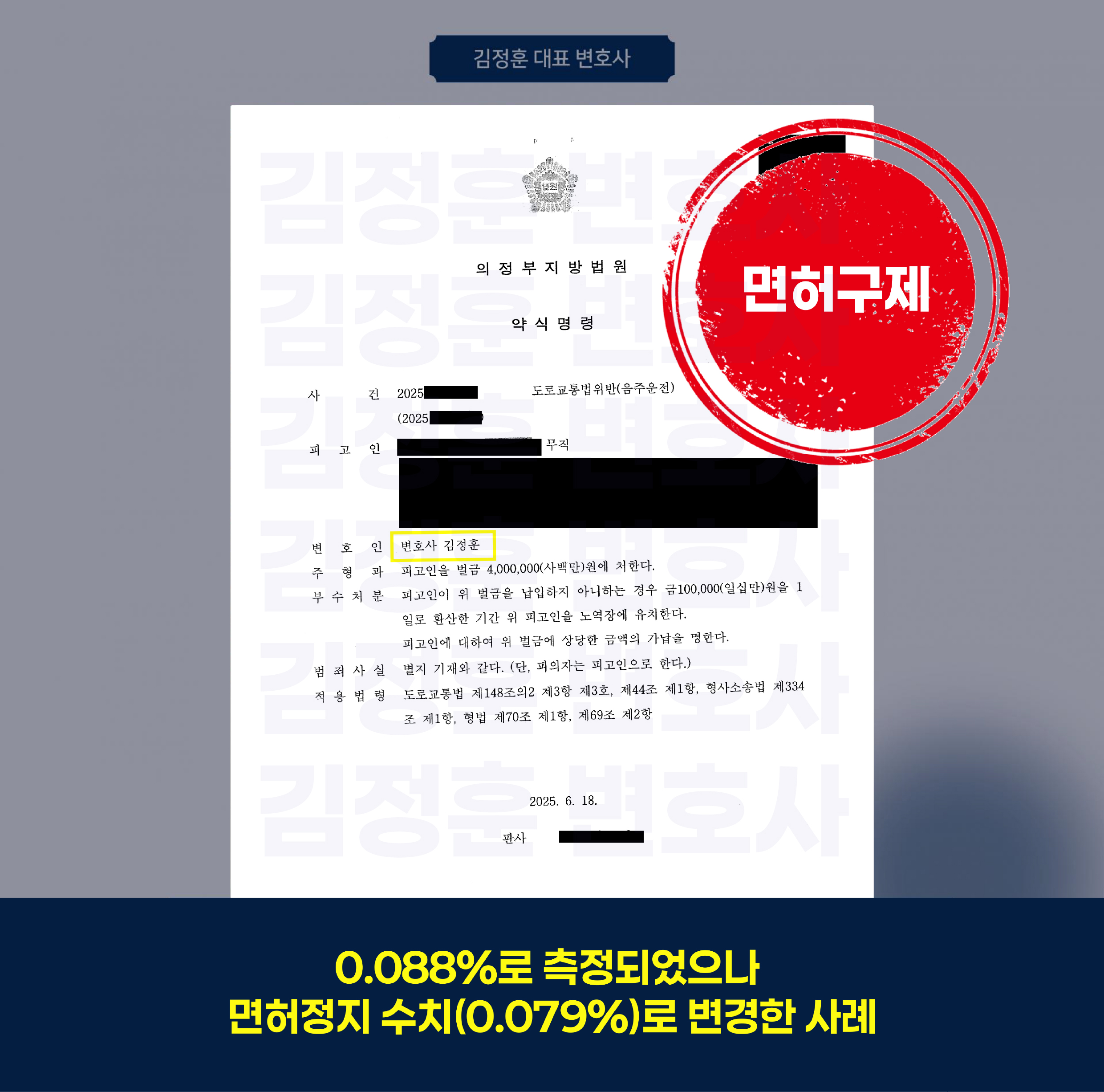 김정훈 변호사는 의뢰인의 음주 시작 시각 및 종료 시각, 최초 운전 시각, 단속된 시각, 음주량(소주, 맥주 등의 종류와 양) 및 체중 등의 신체 조건 등 치밀한 계산 끝에, 운전 당시의 혈중알코올농도는 면허 취소 기준 미달인 0.079%였음을 입증할 수 있었습니다.