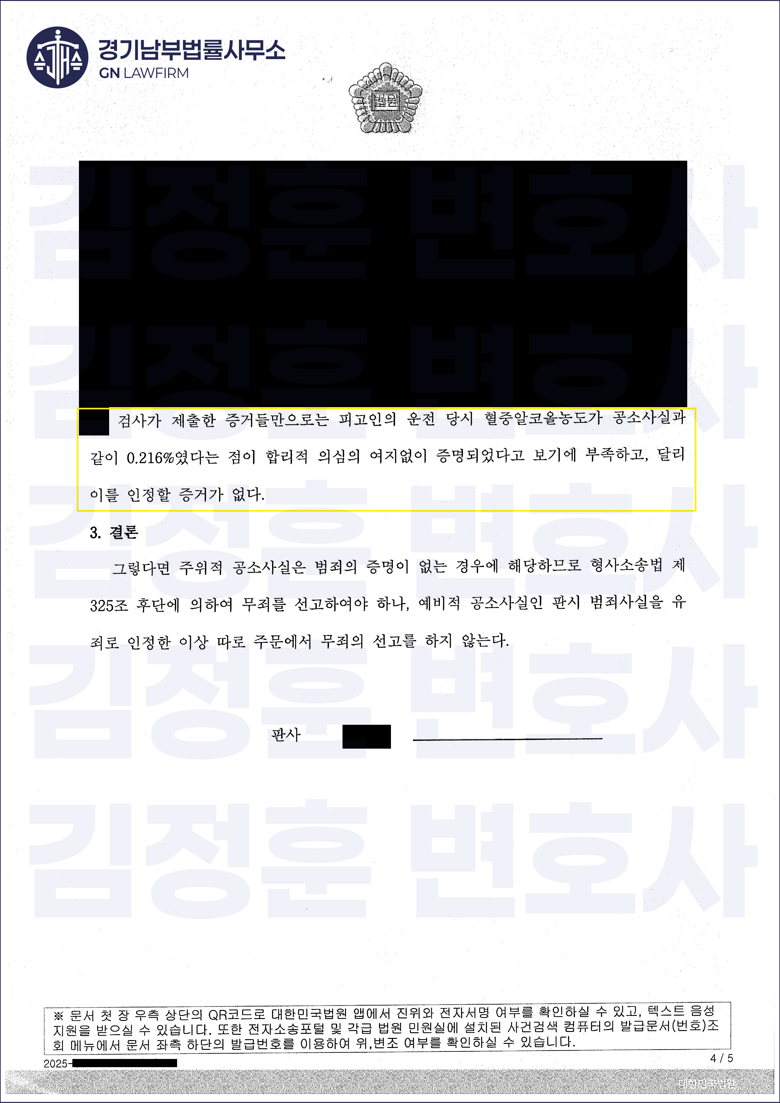 김정훈 변호사는 법정에서 제출한 의견서를 통해 "피고인의 이 사건 운행 당시 혈중알콜농도가 0.200%이라는 공소사실은 합리적인 의심의 여지가 없을 정도로 증명이 되지 않았다"고 주장하며, 당초의 도로교통법 제148조의2 제3항 제1호(0.2% 이상)가 아닌, 제2호(0.08% 이상 0.2% 미만)로 처벌해 줄 것을 요청했습니다.