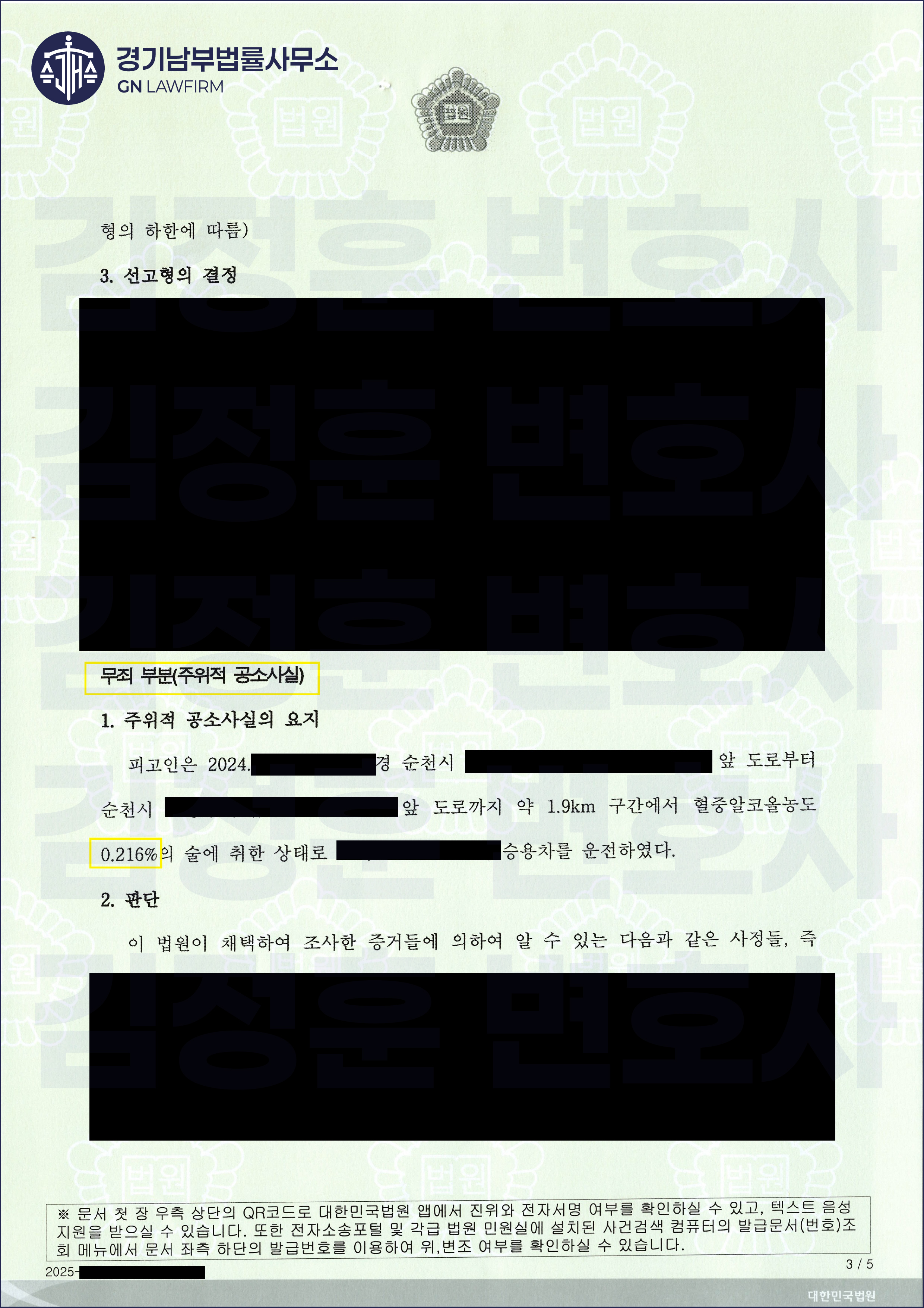 운전 시점의 불분명함: 변호인은 의뢰인의 최종 음주 시각 및 운전 종료 시각이 명확히 밝혀지지 않았음을 지적했습니다. 경찰이 측정한 0.216%의 수치는 운전 종료 시점으로부터 상당 시간이 지난 후인 01:38경 호흡 측정 결과일 뿐, 운전 당시의 정확한 혈중알코올농도가 아님을 강조했습니다.