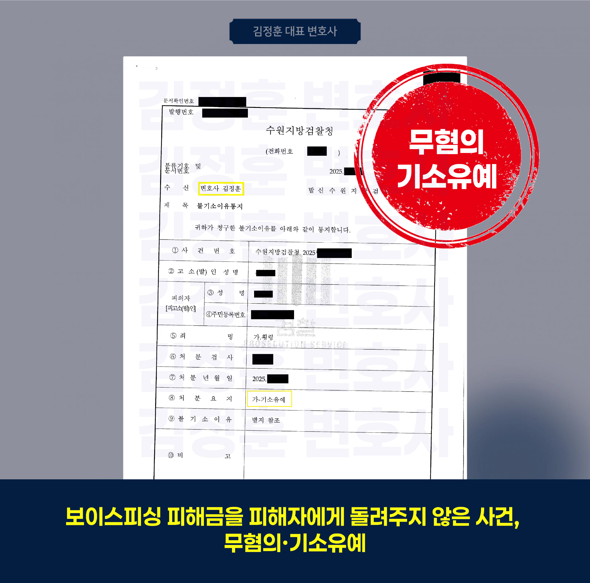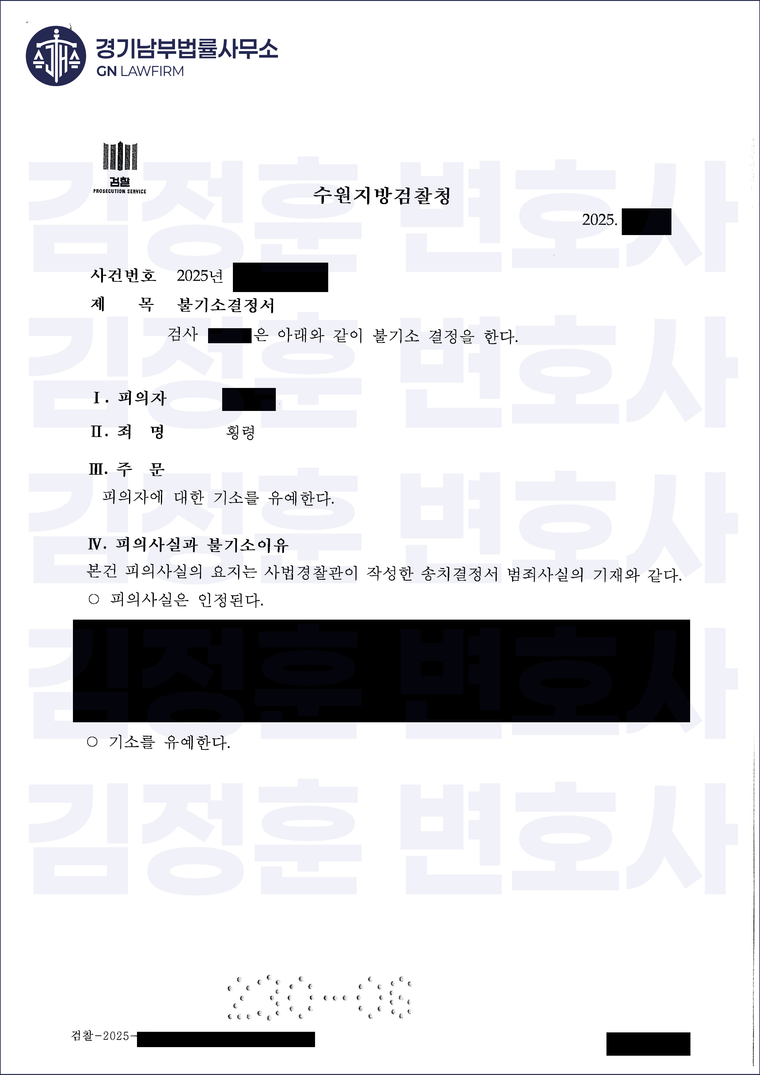 또한, 횡령죄에 대해서도 기소유예라는 관대한 처분을 이끌어내어 의뢰인이 전과자가 될 위기에서 완전히 벗어나게 했습니다. 이는 보이스피싱 사건의 복잡한 구조 속에서도 피해자의 관점과 치밀한 법리 논증이 있다면 절망적인 상황을 극복할 수 있음을 보여준 성공 사례입니다.
