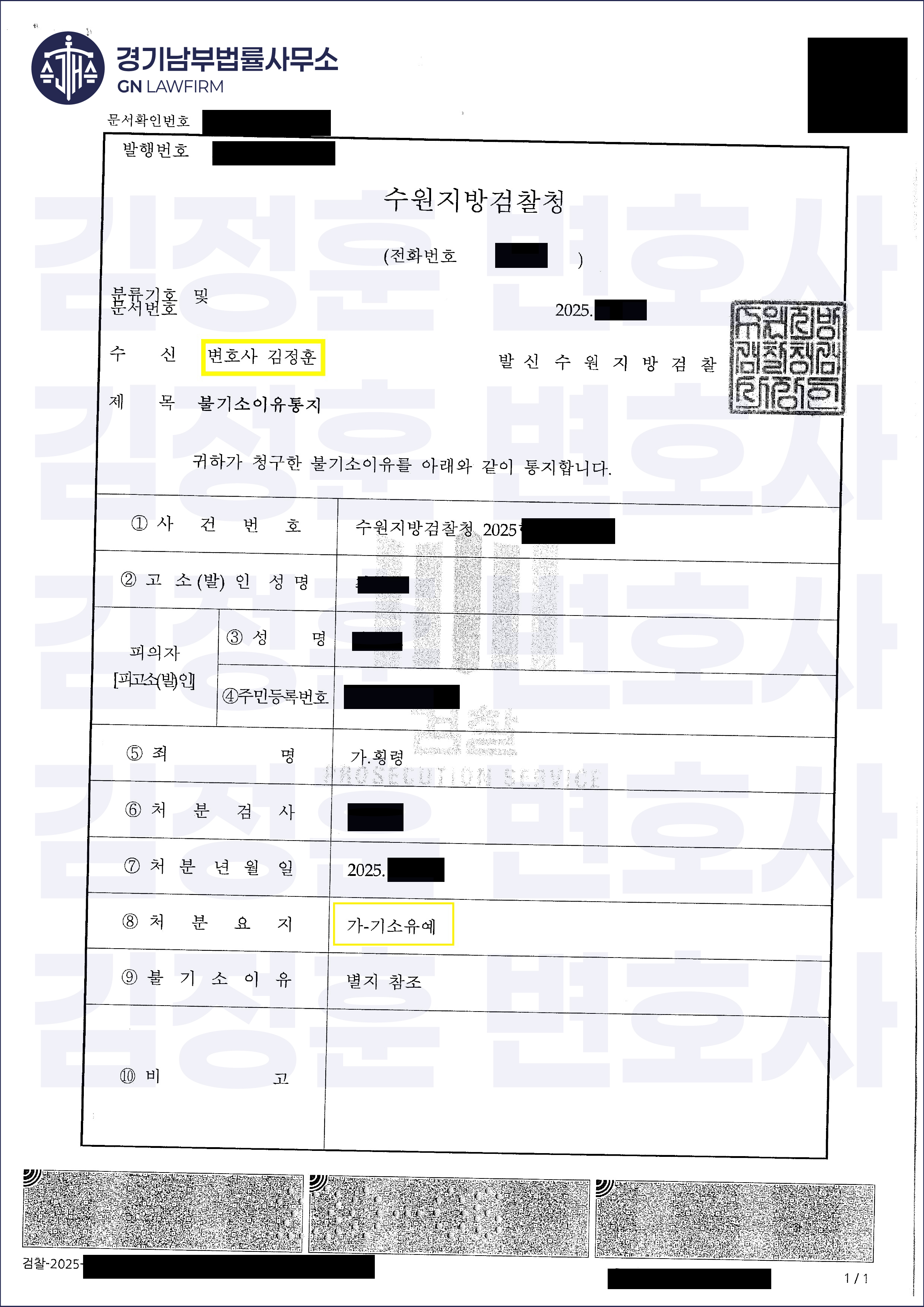 수사기관은 김정훈 변호사의 의견을 경청하며 전기통신금융사기피해방지법 위반 혐의 (주된 혐의)에 대해서는 무혐의 불송치 처분을, 횡령 혐의 (예비적 혐의)에 대해서는 기소유예 처분을 하였습니다.