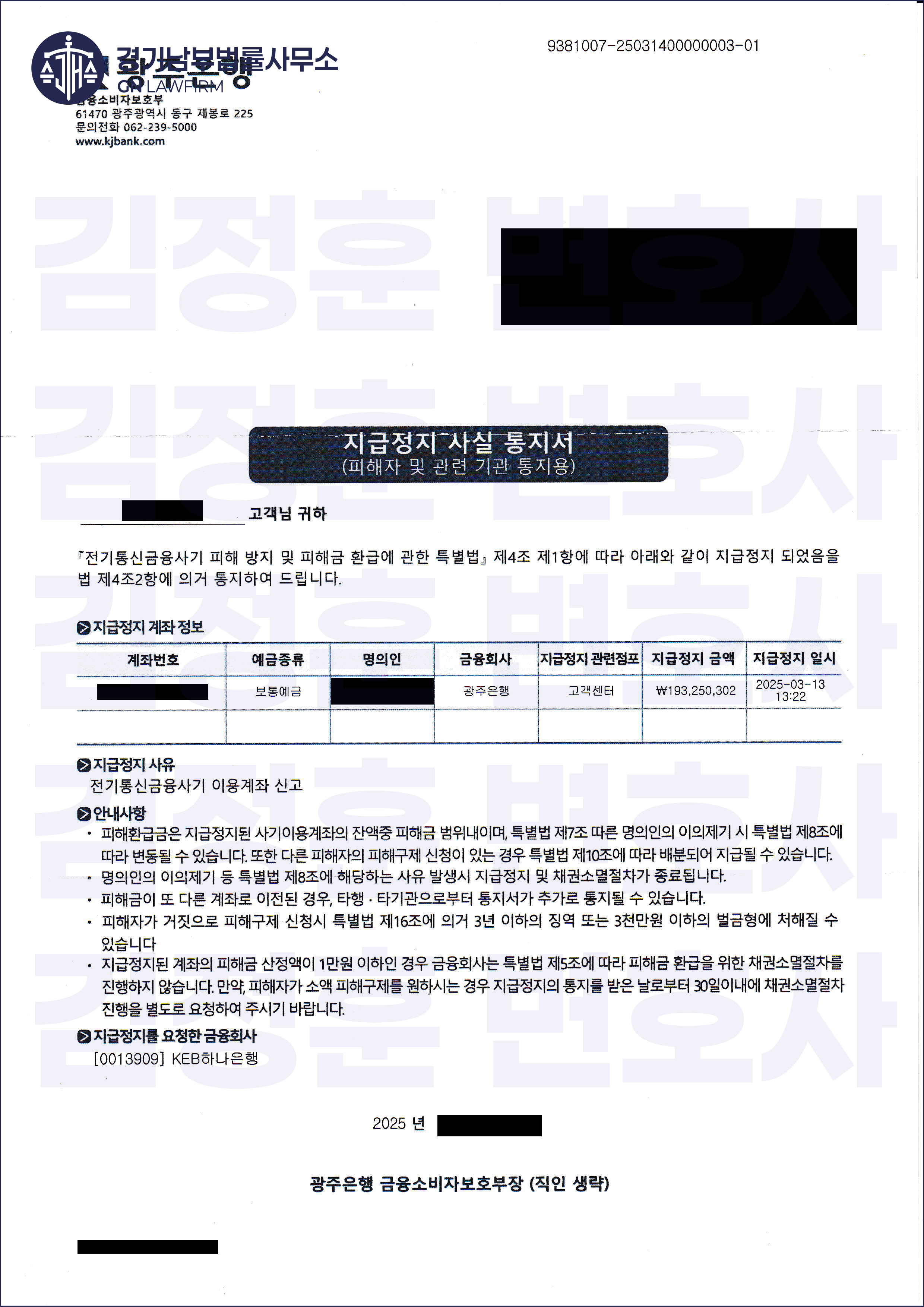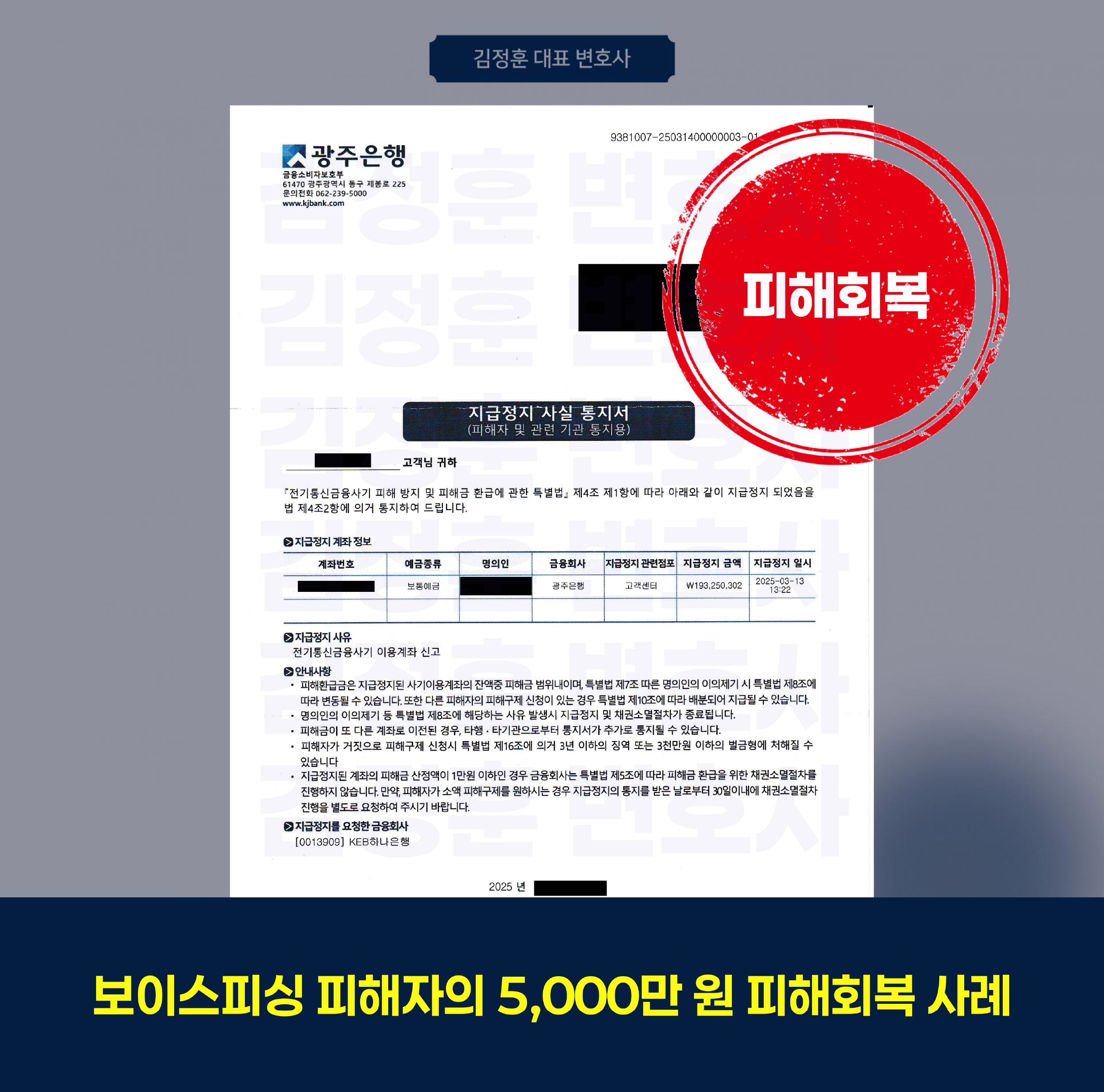 이처럼 신속하고 체계적인 법적 대응 덕분에, 사기 조직이 피해금을 완전히 인출하기 전에 계좌가 정지되었습니다.