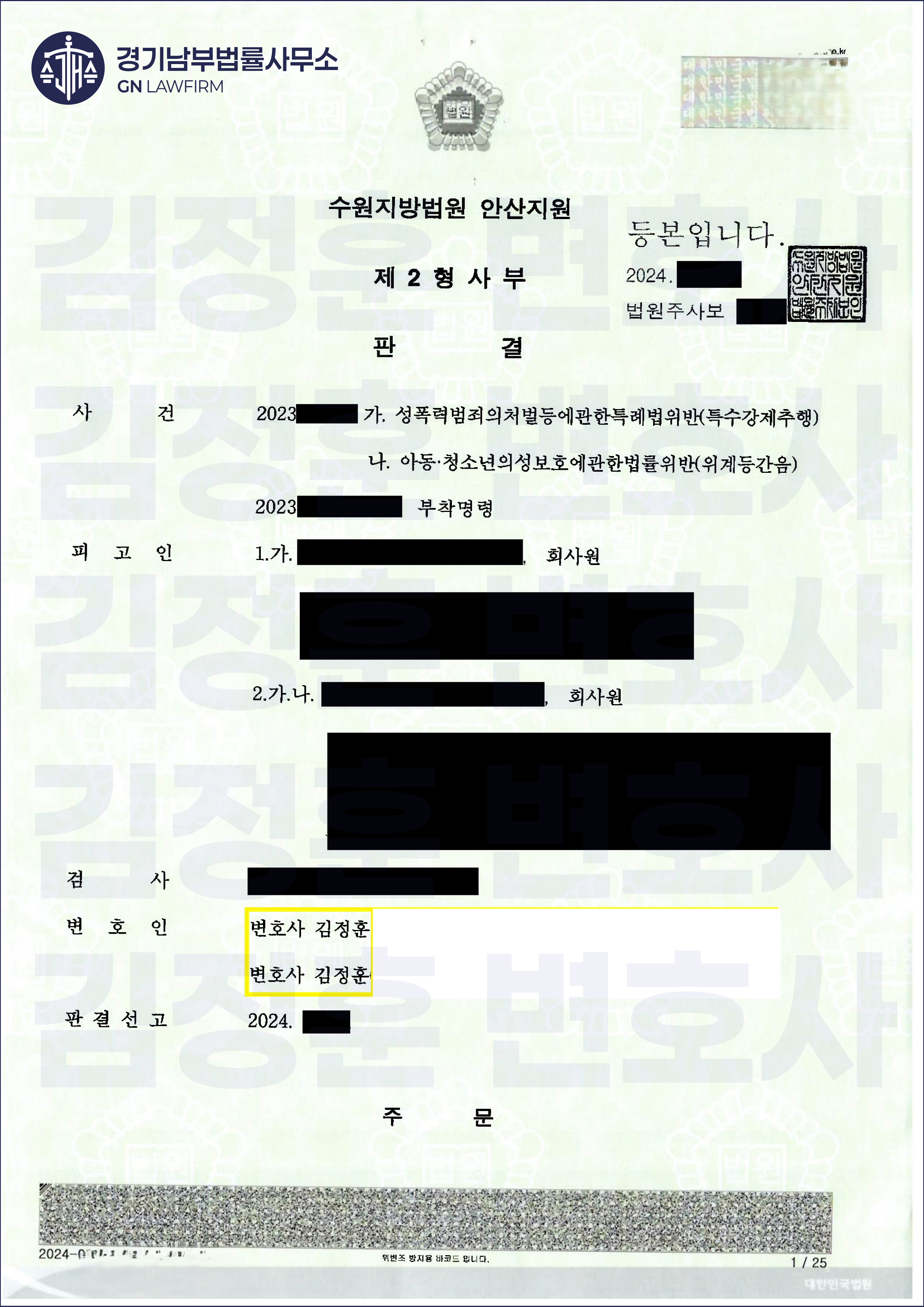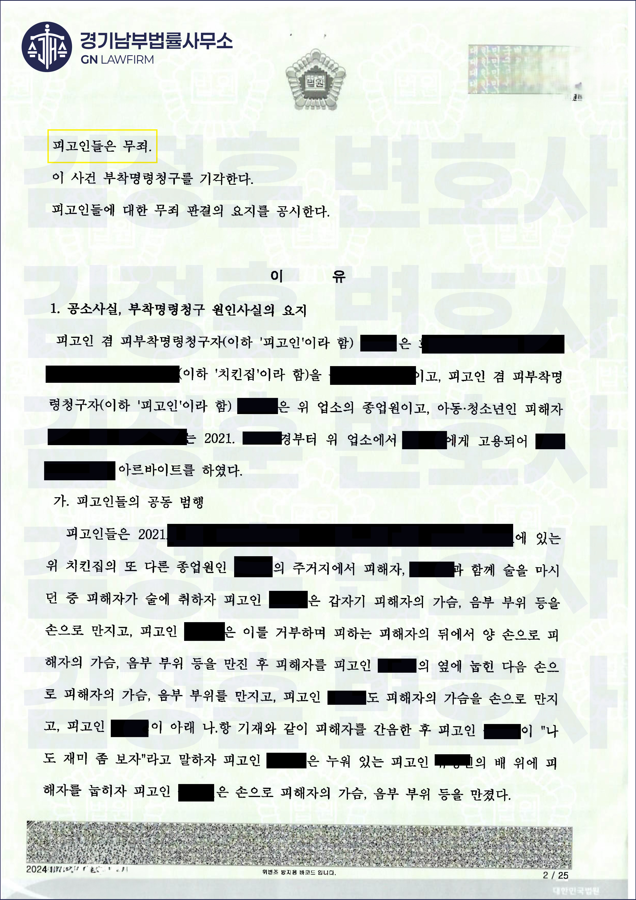 마침내, 재판부는 변호인의 주장을 모두 받아들였습니다. 재판부는 판결문에서 "피해자의 진술은 일관되지 않고 사회통념상 납득하기 어려운 부분이 있어 그 신빙성을 인정하기 어렵다"고 명시하며, 의뢰인1,2 모두에게 '전부 무죄'를 선고했습니다.
