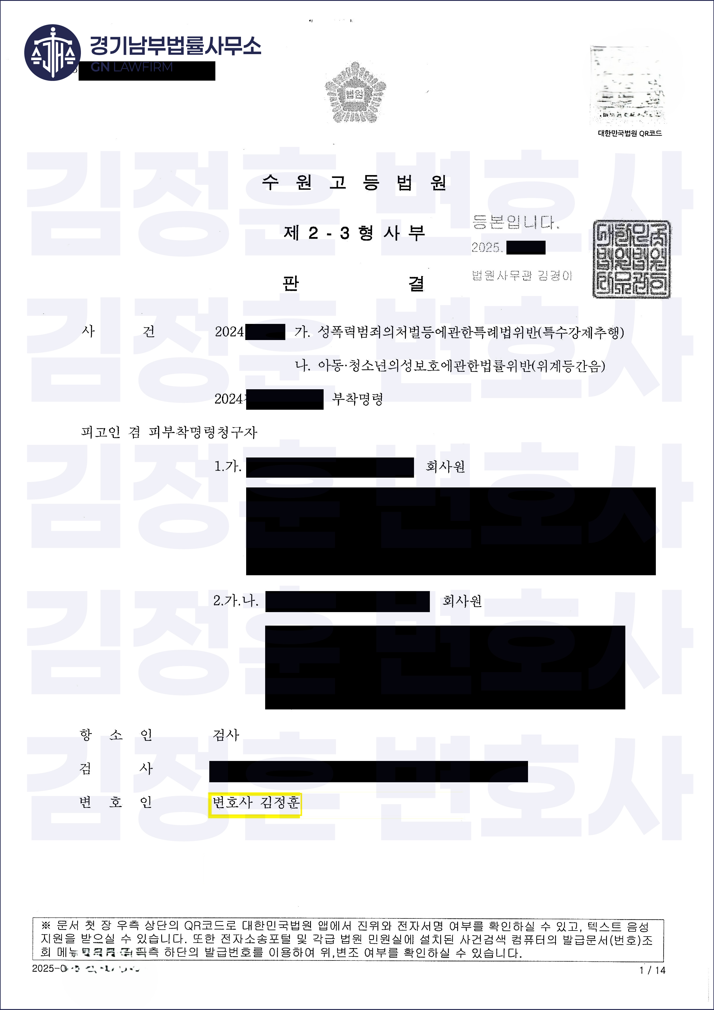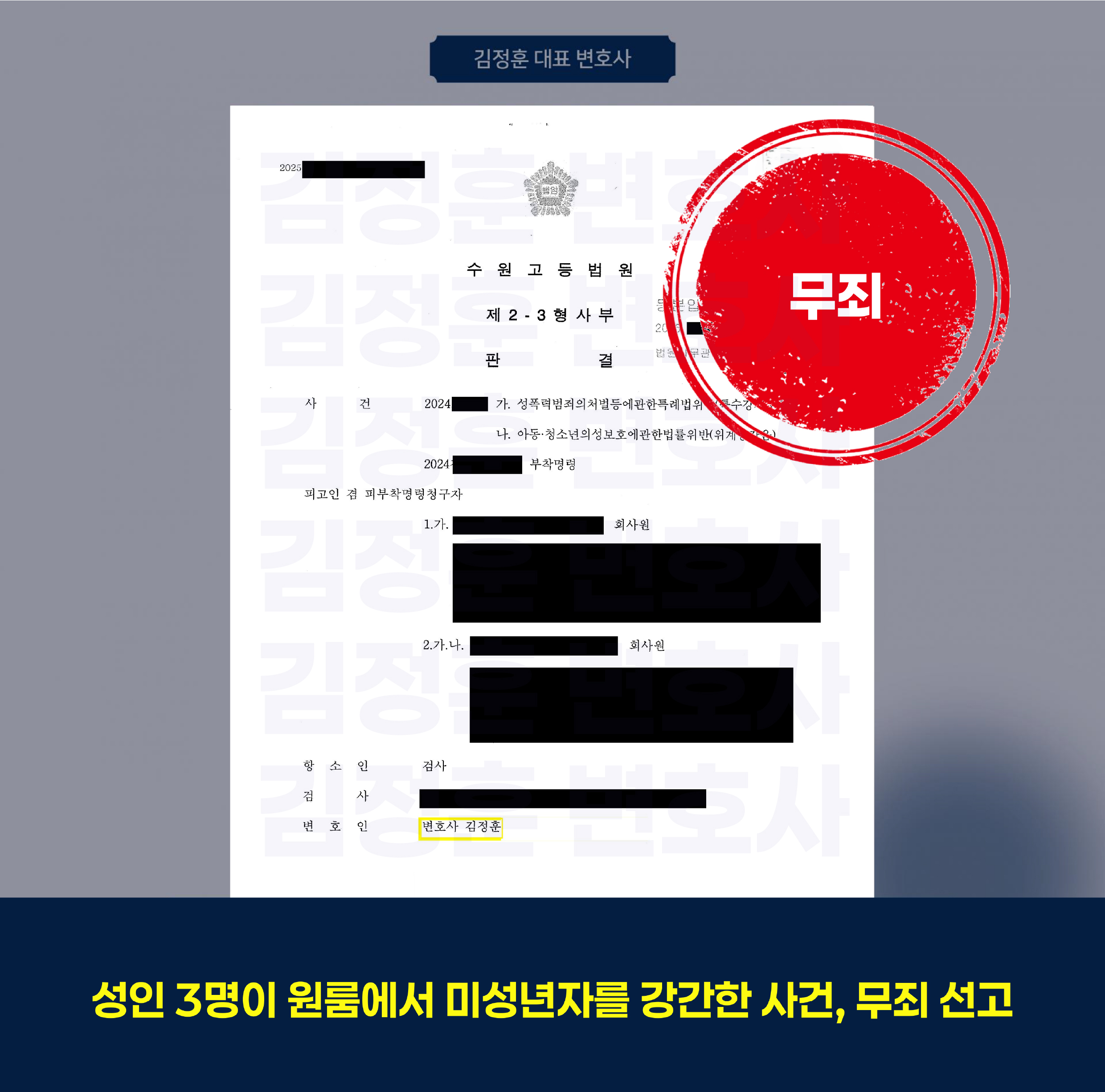 이 판결로 의뢰인들은 비로소 족쇄를 풀고 다시 자신의 삶을 살아갈 수 있게 되었습니다. 검찰은 더 이상 상고를 하지 않았고, 의뢰인들은 가족의 품으로, 친구들의 곁으로, 그리고 평범했던 일상으로 돌아갈 수 있게 된 것입니다. 4년간의 긴 싸움은 끝났고, 정의는 살아있음을, 진실은 결코 거짓에 패배하지 않음을 증명해냈습니다. 김정훈 변호사는 앞으로도 억울한 혐의로 고통받는 이들의 곁에서, 진실이 승리하는 그날까지 끝까지 함께 싸워나갈 것입니다.