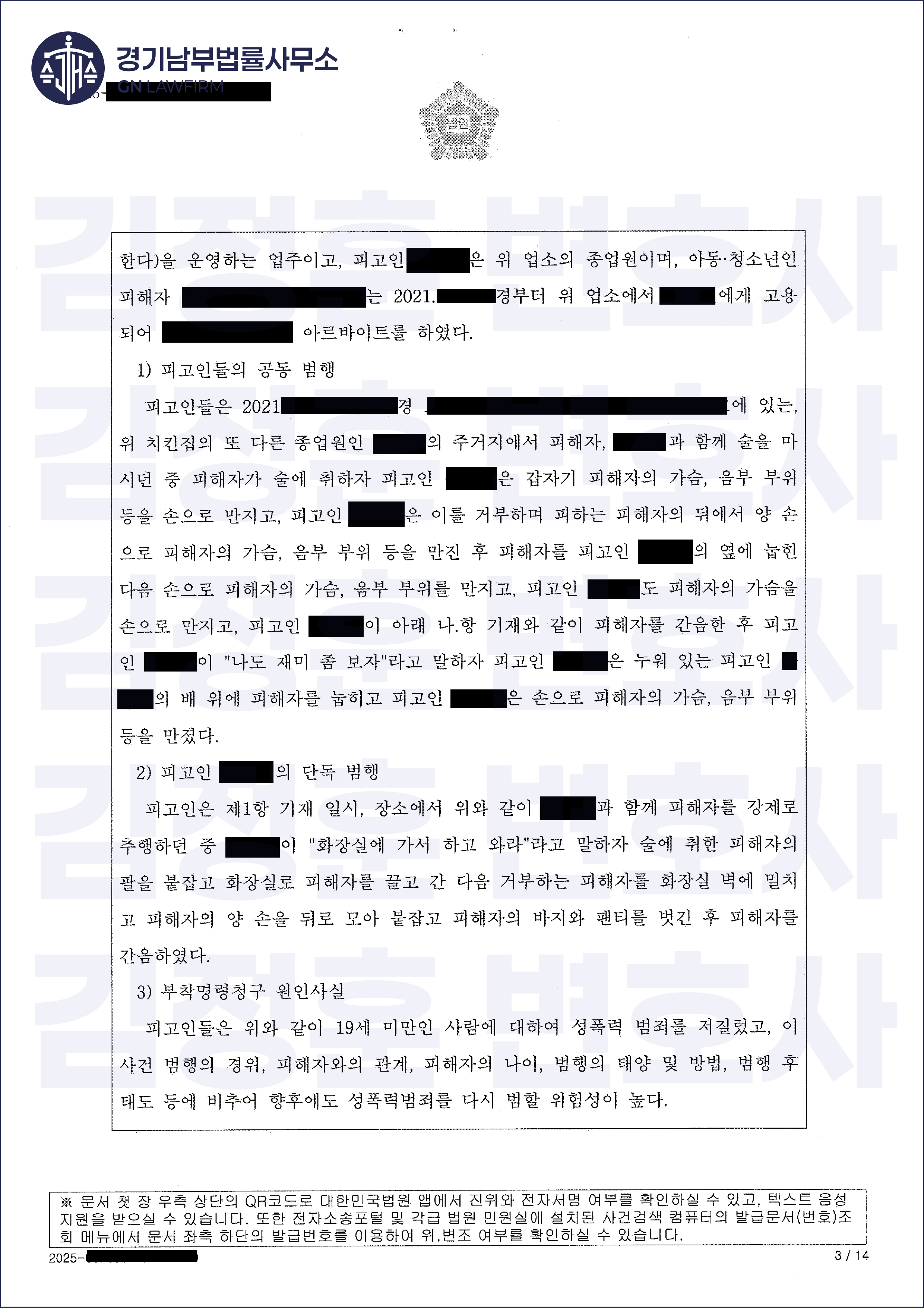 한여름 밤의 회식, 그날의 즐거웠던 기억은 한순간에 악몽이 되었습니다. 저희 의뢰인들은 함께 치킨집을 운영하던 사장과 직원들이었습니다. 아르바이트생이었던 미성년자 피해자와 함께 술자리를 가진 후, 그들은 특수준강간이라는 무시무시한 혐의로 고소당했습니다. 여러 명이 합동하여 원룸방에서 미성년자를 상대로 성범죄를 저질렀다는 혐의는, 사실관계를 떠나 그 자체만으로도 의뢰인들의 인생을 송두리째 파괴할 수 있는 중대한 위기였습니다.