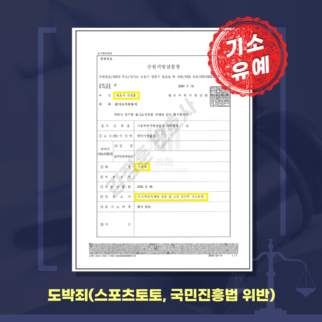 양형자료라는 것은 획일적인 것이 아니고, 각 변호사마다의 노하우가 담겨 있는 부분이며, 도박죄에는 도박죄에 맞는 양형자료를 준비해야 합니다. 김정훈 변호사는 그동안 도박죄, 국민체육진흥법위반죄의 선처를 받는데 주효했던 양형자료들을 골라 의뢰인을 준비시켰습니다.
