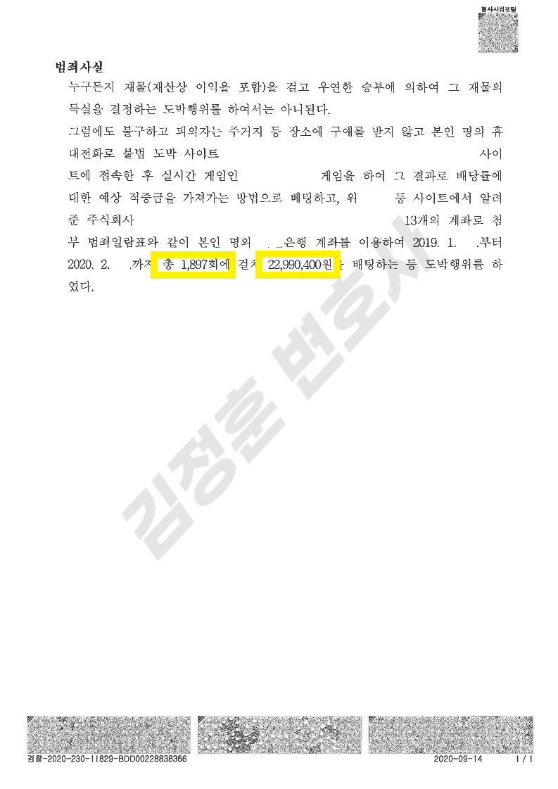 의뢰인은 하루에 1~5만원 정도의 소액을 배팅했다고 생각했지만, 도박죄의 특성상 입출금내역을 모두 합산하기 때문에 나중에 알고보니 본인이 배팅한 횟수는 1,900여회, 총 액수는 2,200만 원에 이르렀습니다.