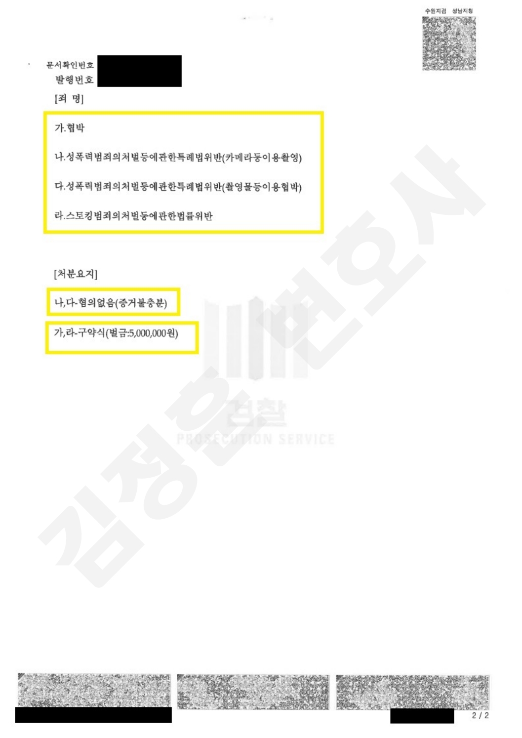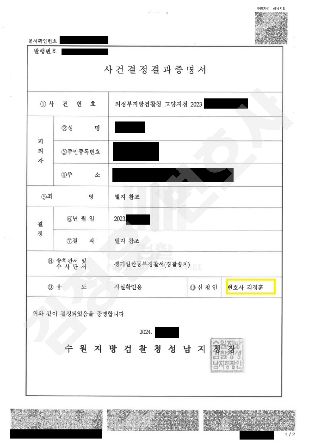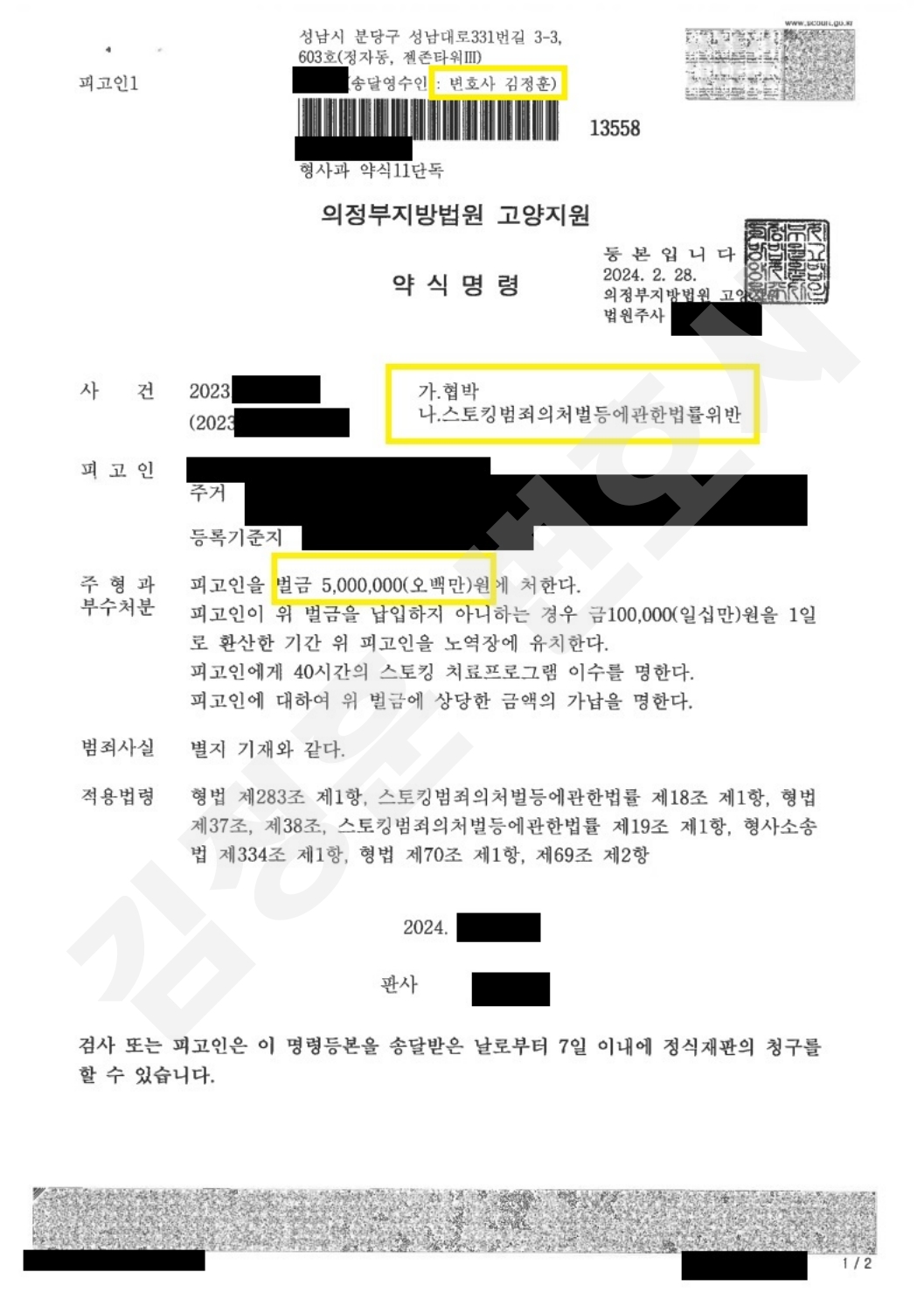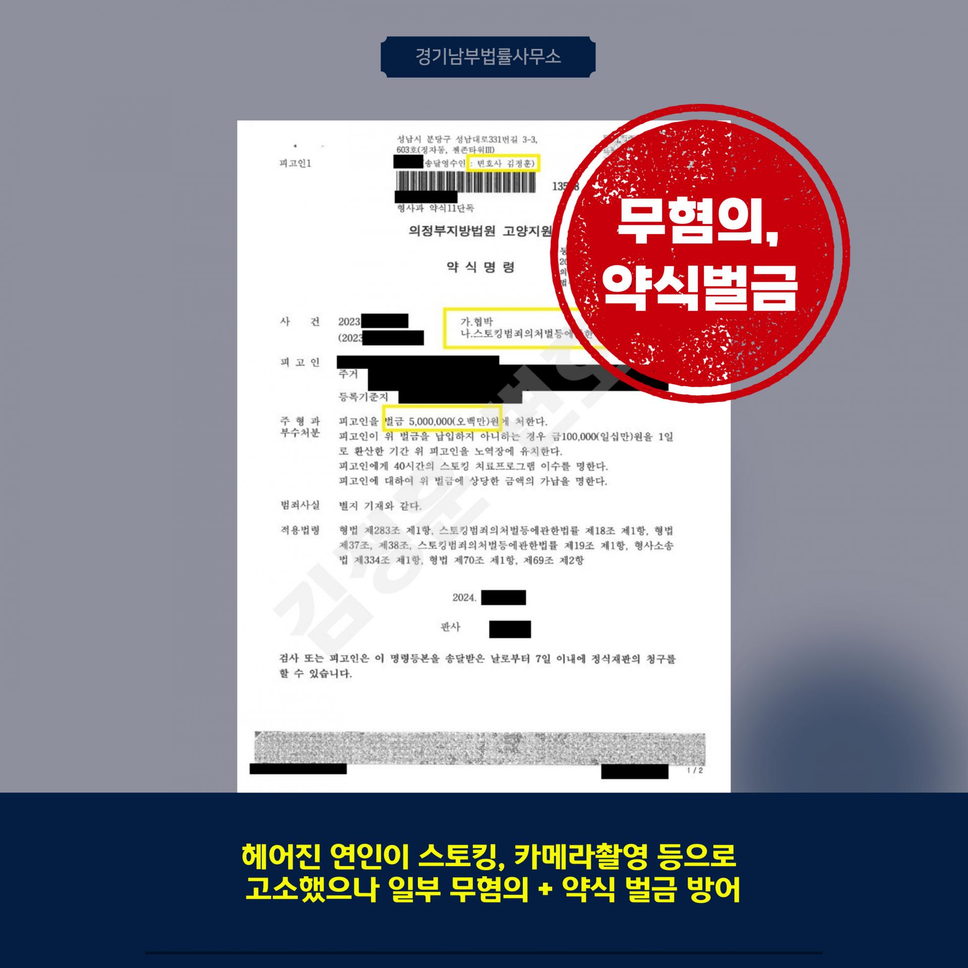 김정훈 변호사는 카메라등이용촬영죄는 합의 하에 촬영 된 것이라는 취지로, 촬영물이용협박은 일반 협박으로 죄명이 변경되어야한다는 취지로 의견서를 제출하여 해당 주장이 받아들여졌고, 스토킹은 워낙 수위가 높았기에 이에 대해서는 반성한다는 취지의 양형 의견서를 제출하여 최종적으로 약식 벌금형이라는 아주 약한 처벌로 사건을 마무리할 수 있었습니다.