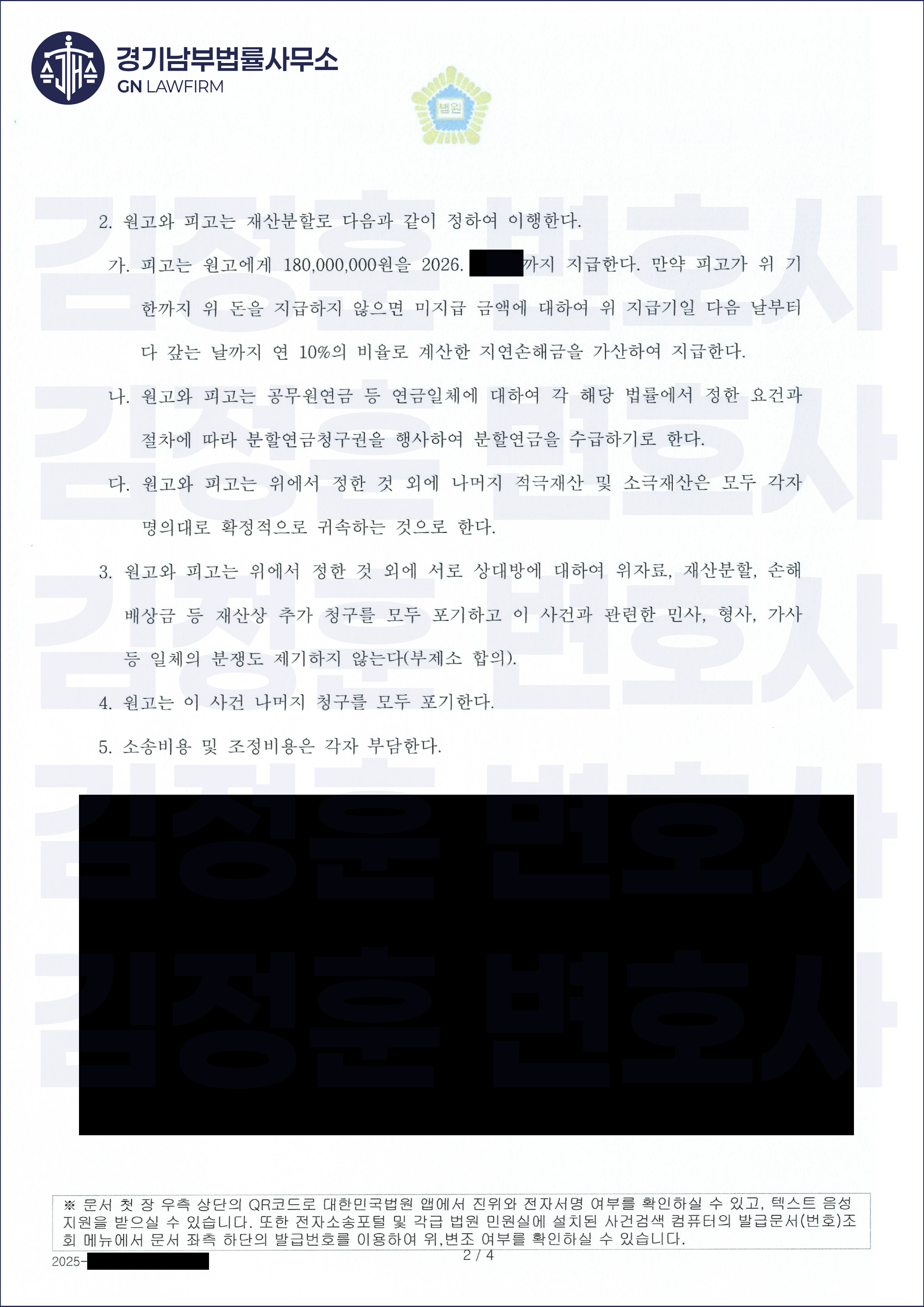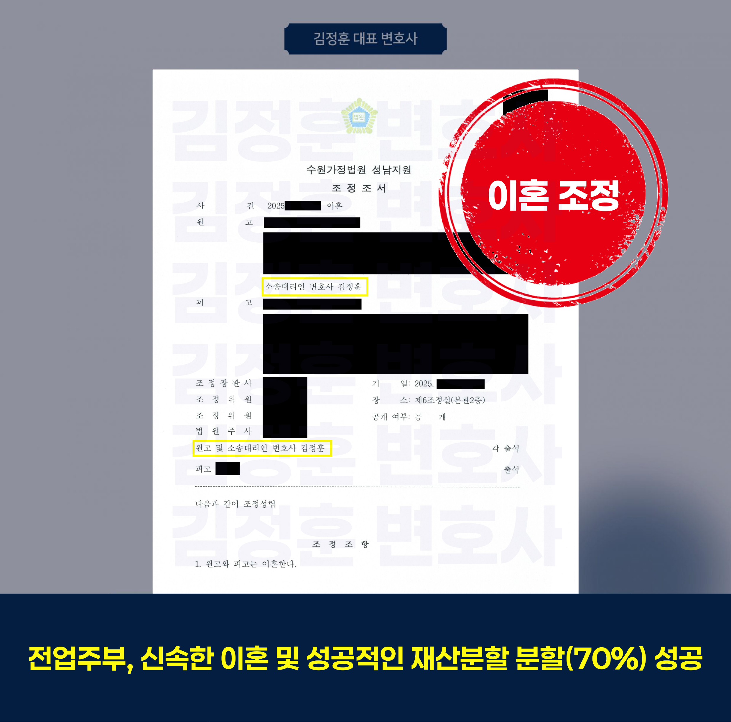 김정훈 변호사는 의뢰인의 안전과 신속한 피해 회복을 최우선으로 하여 조정을 진행하였고, 2025년 10월 수원가정법원 성남지원에서 의뢰인의 이익을 최대화하는 방향으로 다음과 같이 조정을 성립시켰습니다.