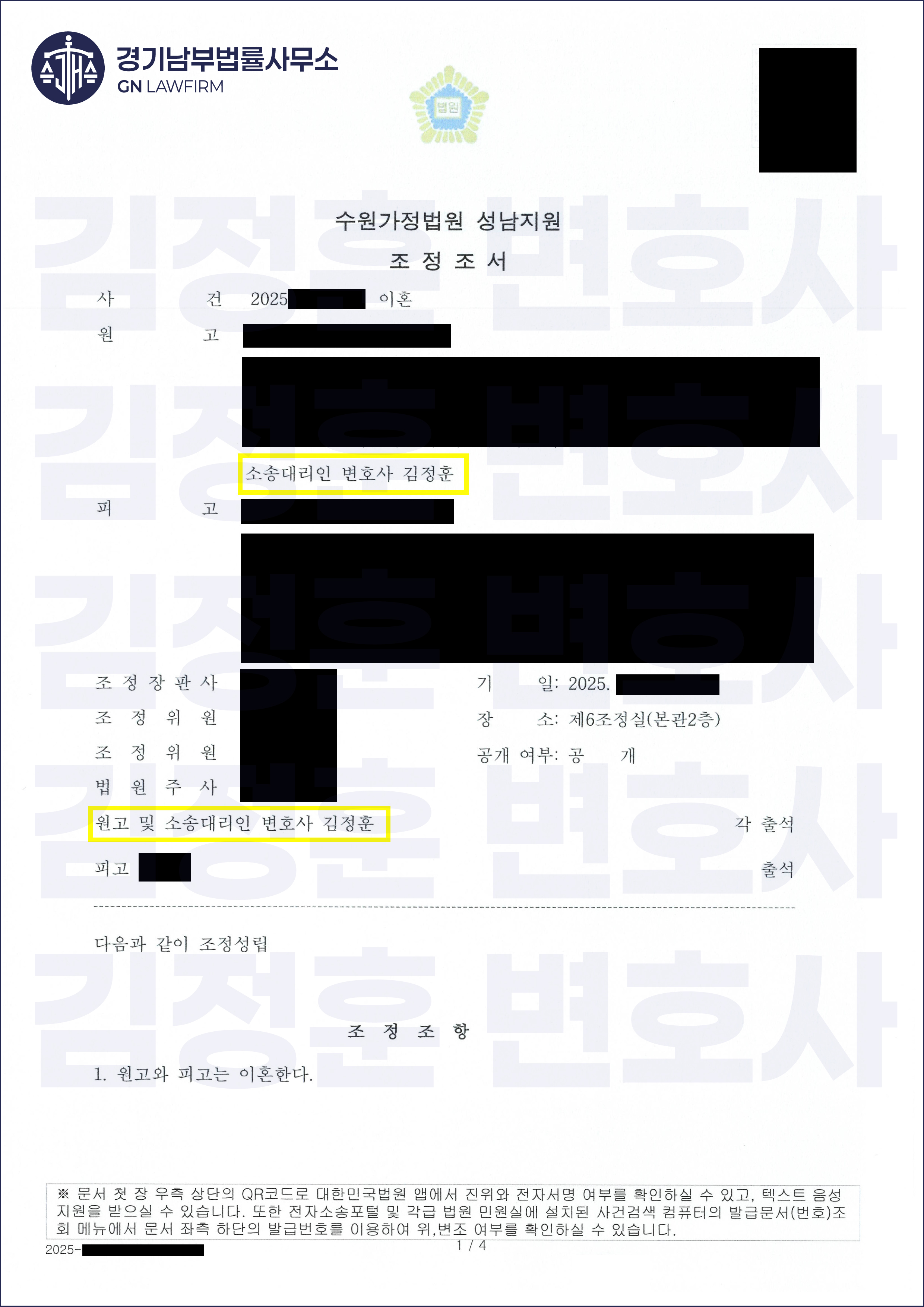 무엇보다 피고의 폭력을 피해 숨어 지내야 했던 의뢰인과 자녀들이, 더 이상의 보복 위협 없이 법적인 이혼을 통해 일상을 되찾게 해 드린 것이 가장 큰 성과입니다. 부디 이 조정조서가 의뢰인과 자녀분들의 존엄한 삶을 되찾는 든든한 방패가 되기를 간절히 바랍니다.